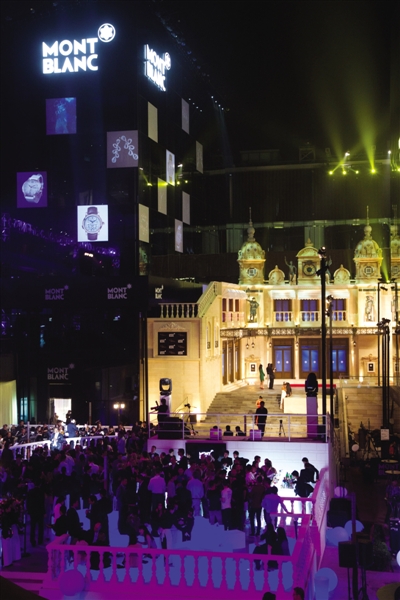 万宝龙花费几千万,将摩纳哥“搬”来北京,在三里屯营造了一个摩纳哥的梦境:中央下沉广场被打造成了上世纪中叶黄金摩纳哥的街景,摩纳哥蒙特卡洛大赌场、巴黎酒店等标志性建筑矗立在广场北侧,红毯随着台阶平铺直下,在广场中央的“大阳台”上,小型的交响乐团现场演奏,伴着黑人歌手blues的磁性声线,一派的纸醉金迷。