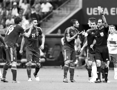 帕帕斯塔索普洛斯(左)在上半场9分钟内连吃两张黄牌,被主裁判卡巴罗(右)红牌罚下,成为本届欧洲杯第一个被红牌罚下的球员。新华社发