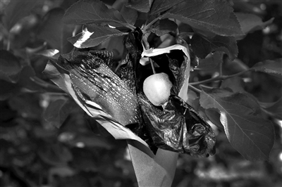 “纸袋里有药,也叫药袋,是禁止使用的。”刘国强有些腼腆地说,当地不少果农套袋时戴口罩和手套,有的甚至将头包裹严实,“像戴上防毒面具”。