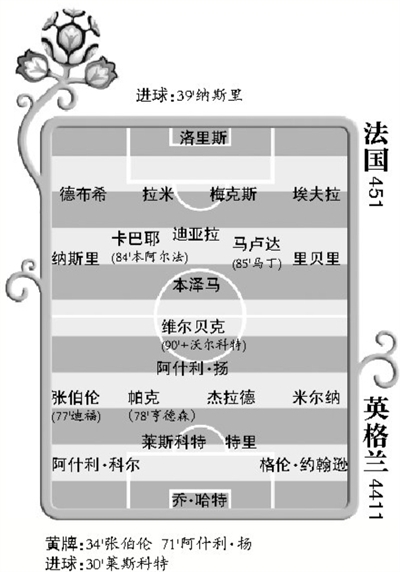霍奇森不缺信心,但在用兵上捉襟见肘,兰帕德、巴里、卡希尔因伤缺席,鲁尼禁赛,迪福因家庭原因缺席此役。不过,残阵英格兰却率先进球。第30分钟,英格兰获得任意球,杰拉德将球传至后点,莱斯科特小禁区线上力压迪亚拉头球破门。法国队并未束手就擒,哈特把守的英格兰球门在第39分钟被曼城队友纳斯里攻破。