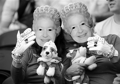 女王驾临?不,假的。两位英格兰球迷戴着英国女王的面具观赛。