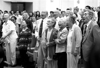 庆祝活动成为了难得的一次聚会,在座谈会结束后,郑榕(左一)、朱旭(左三)和朱琳(右四)、苏民(右一)等人艺艺术家全体起立唱国歌。新京报记者 郭延冰 摄