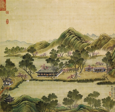 “武陵春色”的灵感则来源于陶渊明《桃花源记》。陶渊明笔下的“桃花源”本来就是他做的一个梦,圆明园的“武陵春色”却是“梦上加梦”,盛时此地山桃万株,东南部叠石成洞,名为“桃花洞”,可乘舟沿溪而上,穿越桃花洞,梦回“世外桃源”。