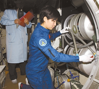 6月15日,刘洋在模拟天宫一号组合体内检查实验设备。新华社发