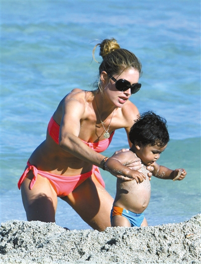 6月18日,美国迈阿密,超模杜晨·科洛斯与爱子沙滩边玩乐。