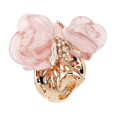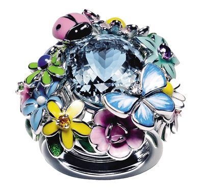 与此同时,维多利娅在作品中亦热衷于表达自己对“女性”的理解。“在她看来,美丽诱人或者天真纯美只是女性的一面,但使这一面更具魅力的是她们所具有的另一面——邪恶。”因此,维多利娅并不满足于传统珠宝在花朵主题上“无毒无害”的倾向,用17种色彩艳丽诡谲的毒性花卉打造出了惊世骇俗的Belladone Island系列,之后的Milly Carnivora系列虽然主题相同,但彩漆工艺的使用使其“恶毒”级别降低,稍显平易近人。这两个系列中我们可以看到形态妖冶的红、黑、绿花蕊,亦有雄蕊在吸取中心宝石精华后新发的枝桠,由于贪婪而溢出的琼浆甚至在戒指指环底部化成荧绿的毒液。对此,维多利娅表示,“食人花犹如那些与充满敌意的社会孤身奋战的妇女。我设计出一款珠宝,她表达着一种爱意、一种庇护和某种独立精神。”最为邪恶的设计出现在Belladone Island系列中的Carnivo Papidevorous,拥有红色宝石心脏的蝴蝶在展翅时拥有诡异的鳞粉,而这种视觉冒险并未就此结束,通过机关将翅膀收拢,背后的十颗红色尖晶石便骤然出现在你面前,让人不由一阵鸡皮疙瘩,惊悚感不亚于看一场优秀的恐怖电影。
