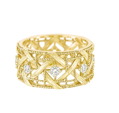 相比之前繁复耀眼的设计,My Dior用截然不同的简练姿态打开了Dior高级珠宝的新篇章。这个系列看似简单的“金质丝网”设计,实为来自颇有故事的“藤格纹”(cannage)。这种图案最初出现在Dior服装秀所使用的拿破仑三世椅子上,Eau Fraiche香水盒上的“trompe-l'oeil”(幻象感)字样中也运用了这种图案。维多利娅儿时陪母亲逛Dior精品店时对这种纹样印象深刻,于是在多年后成为Dior珠宝艺术总监时,终于得以将这段情结放入最新的设计中。My Dior的藤格纹由相互交织的金质缎带和金质丝线手工铸成,奢华钻石以爪镶镶嵌与闪亮式镶嵌嵌入,整体效果更为灵动。