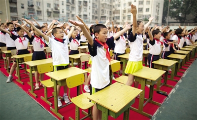 6月21日,羊坊店中心小学第十一届天使奥运会开幕式。孩子们表演学校创立的校园击缶健脑操。