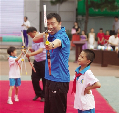 孩子“教”奥运会射击冠军杨林射箭的姿势。