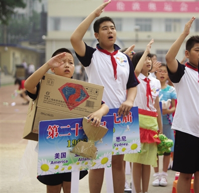 虽然是模拟,但程序可一点不少。在国旗下,饰演各国选手的学生们一起庄严地朗诵了《体育颂》,之后,进行了运动员、裁判员代表宣誓。2008年北京奥运会上大气磅礴的击缶表演至今历历在目,受此启发,羊坊店中心小学学生们将击鼓演绎成击课桌。“噼、啪”学生们用手掌有节奏地敲打着课桌,声音嘹亮响彻四周,引得周边居民楼的街坊们纷纷开窗欣赏。