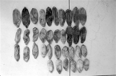 哥伦比亚籍男子迪亚斯排出的36袋人体毒品。