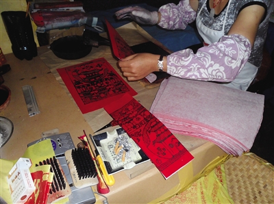 42岁的古雨,坐在卧室里,在一块模板上刷着廉价墨水,然后用一张红纸蒙上去、揭下来。这是她现在的工作,印刷祭祀时用的“清洁纸”。