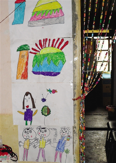 古雨将儿子的绘画作品贴在家里的墙上。