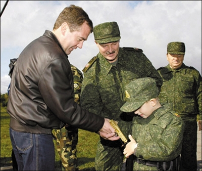 据称,尼古拉·卢卡申科最喜欢的玩具是武器,且“枪不离身”。梅德韦杰夫对他的“枪”也很感兴趣。