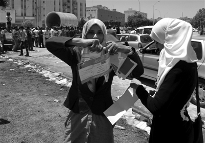 7日,同样在班加西,不满议席分配的选民在投票站外撕选票。