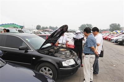 上周,旧机动车市场内几位顾客正在看一辆待售二手车。