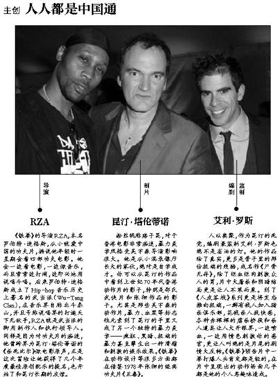 《铁拳》(The Man with the Iron Fists)日前放出首款预告片,全世界再次将目光投向了遥远的东方国度,这部投资2000万美元的好莱坞电影曾在上海和浙江横店影视城拍摄。元奎担任武术指导,更有刘玉玲和吴彦祖等一众中国面孔,除了场景上尽显中国风元素,在中国功夫上同样血统纯正。故事发生在十九世纪的中国封建王朝,一个给自己打了副“铁手套”的黑人铁匠,为了捍卫自己和村民们的自由,从此打遍天下。剧组的幕后班底大部分都是中国的工作人员,其实影片的导演RZA和制片人昆汀·塔伦蒂诺也都是十足的中国通。他们都是上世纪70年代邵氏武侠片的铁杆粉丝,特别是张彻电影中那个血浆狂洒的重口味江湖。