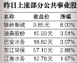 其中水利建设板块中,中小板公司利欧股份大涨9.94%居于首位。利欧股份是目前国内最大的园林机械和家用泵生产企业。业务涉及城市防洪工程的围海股份、涉及管道制造的青龙管业、涉及泵机的新界泵业,以及防水材料提供商东方雨虹等都有一定幅度的上涨。公共事业板块中,巴安水务、江南水务、东江环保等均上涨。在北京有污水处理等业务的首创股份昨日收盘亦上涨1.31%。