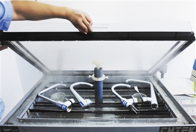 水龙头盐雾试验中,质量不好的水龙头表面会产生“铜绿”、黑色斑点或腐蚀。 新京报记者 尹亚飞 摄