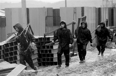 昨日,房山区安置房建设工地上,工人们冒雨进行工作。 实习生 王飞 摄
