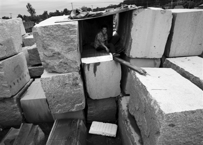房山周口店瓦井村,一家石料厂的工人在石料堆上搭了个小窝棚居住。新京报记者 郭铁流 摄