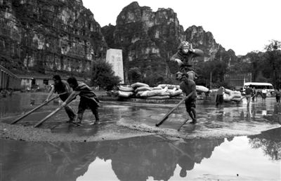 昨日,房山十渡某度假村,工作人员正在清淤。他们希望尽快恢复营业接待顾客,往年的此时是旅游旺季。新京报记者 郭铁流 摄