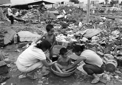 被冲毁的石板厂内,大人正给孩子洗澡。 新京报记者 郭铁流 摄