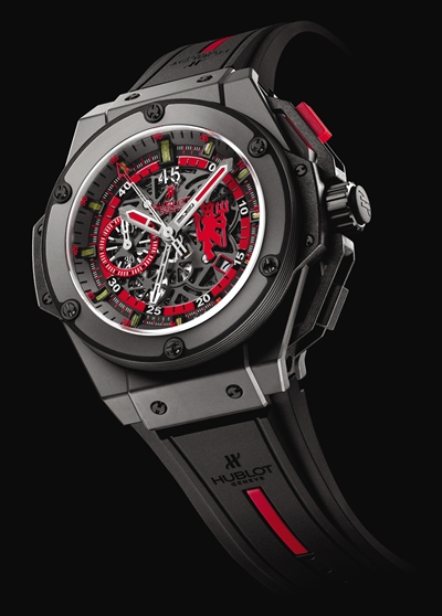 “英国足球豪门”曼彻斯特联队与宇舶表的合作已经到了第四个年头,宇舶自2008年起便正式成为了曼联的“官方计时器”,并陆续推出了以“红魔”命名的三款限量版腕表。本次秀前展出的“红魔三代”也吸引了大量眼球。较之“红魔一代”与“红魔二代”,这只表无论外观还是材料都进行了颠覆式的改革。表盘的镂空设计使佩戴者得以窥见机芯的运作,中心两根醒目的平直指针方便读时,其中一根指针特别为足球比赛而设计,与内表圈白色的阿拉伯数字一同明确计时45分钟的半场时间。而在此之前的两款表,45分钟计时均以小表盘呈现于9点钟位置。