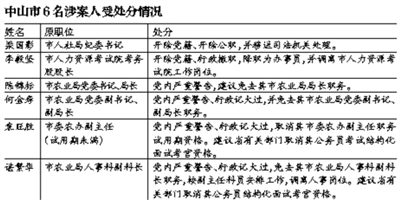 中山市纪委、监察局相关负责人说,在该案涉及的党员干部中,有处级干部4人,分别为中山市人社局纪委书记梁国影,中山市农业局党委书记、局长陈锦标,中山市农业局党委副书记、副局长何金寿和中山市农业局人事科原科长、现中山市委农办副主任袁旺胜(试用期未满);科级干部1人,为中山市农业局人事科副科长谌繁华;其他干部1名,为中山市人力资源考试院考务股股长李毅坚。