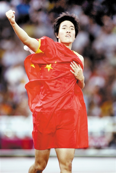 ②2004年,刘翔在雅典奥运会夺金后庆祝。
