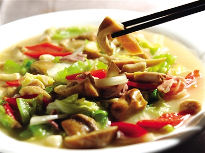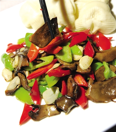 能跟干巴菌比拼一下的菌子还是有的,在楚雄一带出产一种虎掌菌,一般的做法是搭配豆芽,一黑一白,叫银芽虎掌。这种菌子长在险恶之处,状如虎掌。我听一个云南餐饮企业的老总说,所有的菌子都会有微毒,不能上国宴,只有这虎掌菌是上国宴的。虎掌菌肉质紧实,香气致密而迷人,算是菌子里的刀马旦,菌子里的穆桂英。