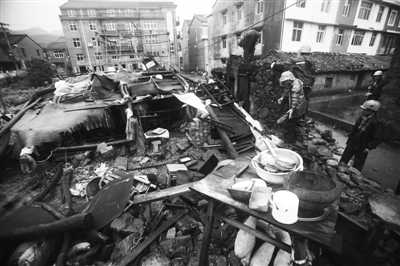 昨日,工作人员在清理童小凤老人倒塌的房屋。当日,浙江临海一独居老人被转移10分钟后房屋倒塌。新华社发
