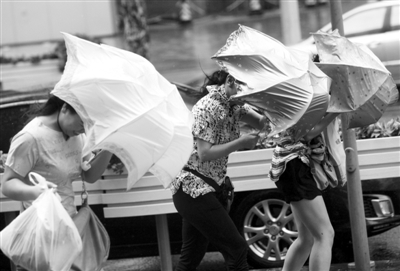 昨日,台风“海葵”袭击上海,市民的伞被吹得歪七扭八。艾西 摄
