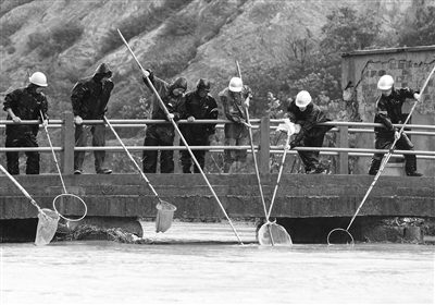 昨日,在台风“海葵”的登陆点浙江象山县鹤浦镇,村民趁着台风过后纷纷拿出渔网在内河河道上捕鱼。