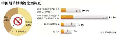 新探健康发展研究中心网络调查结果显示:8月11~20日进行了中国烟草博物馆控烟调查。10天时间里有1502人参与,其中吸烟者40%,不吸烟者60%。