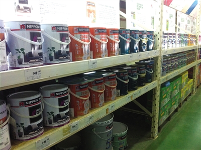 在某建材超市内,立邦漆和其他知名品牌漆摆放在一起,但各种“功能”、价钱不一的产品让一些消费者摸不着头脑。