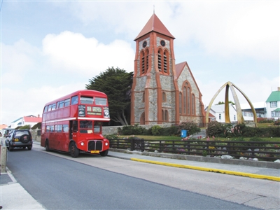 马岛(英称福克兰群岛)上行驶着英式红色双层巴士。