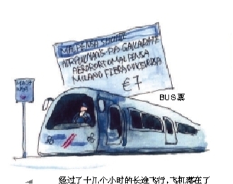 经过了十几个小时的长途飞行,飞机落在了米兰的马尔蓬萨机场。取了行李,开始寻找到达市区的巴士车,按照指示牌,在候机楼B2层,第5出口和第6出口之间找到了BUS售票口。 到达市区中心火车站的票价是7欧元。