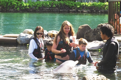 孩子们与酒店乐园里的海豚嬉戏