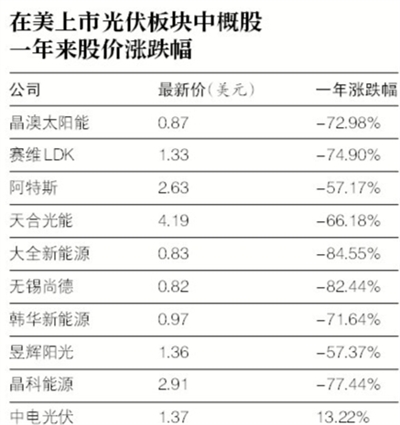 欧美经济不景气,政府缩减对新能源补贴让光伏市场缩水,另一方面中国企业产能不断扩展带动价格下滑。这些境况在在美上市的光伏中国概念股公司股价上得到充分反映。
