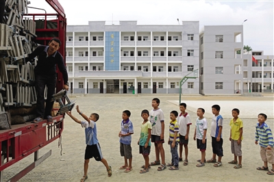 9月6日,麻城市顺河镇的中心小学,孩子们排队搬运刚刚运到的新桌椅零件。