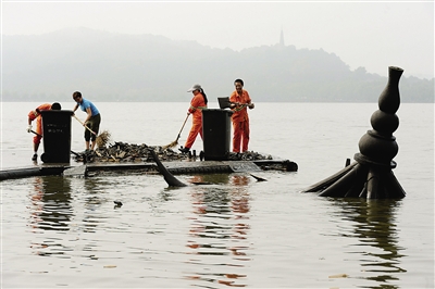 记者在现场看到,集贤亭所在的平台已经放置警示标志,西湖水域管理处派出多艘应急船只,将落入湖内的亭子拆卸运离湖面,亭内的对联、牌匾等物也被打捞起来。