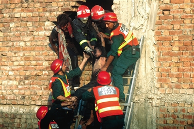 11日,巴基斯坦拉合尔,救援人员营救鞋厂被困员工。