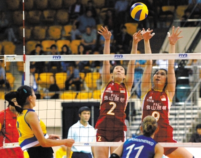 中国队米杨和杨珺菁(右)在比赛中双人拦网。新华社发