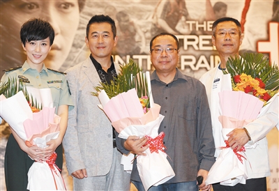 导演尹力(左三)携丁柳元、王志飞和刘佩琦出席影片发布会。新京报记者 郭延冰 摄