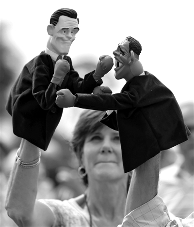 9月20日,美国佛罗里达州西部城市萨拉索塔,在罗姆尼竞选集会召开前,一位女士手持代表罗姆尼和奥巴马的玩偶对打。