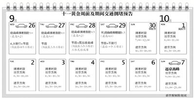 北京市交通委表示,国庆假期出京方向集中在9月30日至10月2日,进京方向集中在10月6日至7日。节假日期间车流量的高峰时段为前三天的早8:00-12:00及最后一日的14:00-21:00。