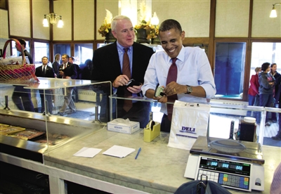 22日,美国密尔沃基,奥巴马与当地市长在熟食店结账时,掏出一大把钞票。