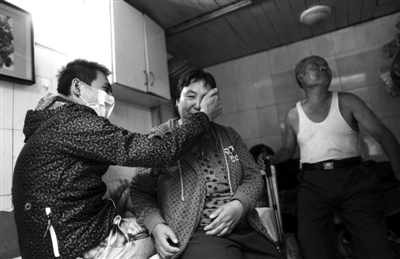 昨日,租住的小屋里,身患白血病的王海福给母亲擦眼泪,其父站在他们身后。新京报记者 薛珺 摄
