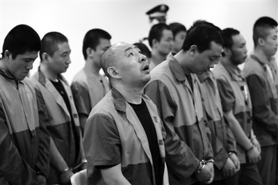 昨日,海淀法院,北京今年最大的非法组织卖血案开庭,12名被告人均表示认罪。其中,“血头”王海涛(前排左一)称,作案是为救助患病的弟弟。通讯员 李森 摄